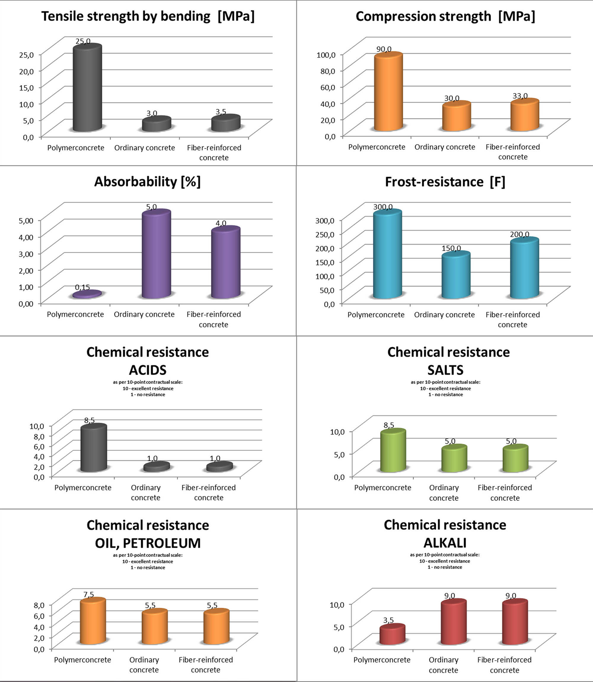 Il grafico presenta un confronto delle principali proprietà tecniche tra polimerobetone, calcestruzzo tradizionale e calcestruzzo fibrorinforzato. I risultati dimostrano chiaramente che il polimerobetone offre prestazioni significativamente superiori in termini di resistenza meccanica, durabilità e resistenza chimica.